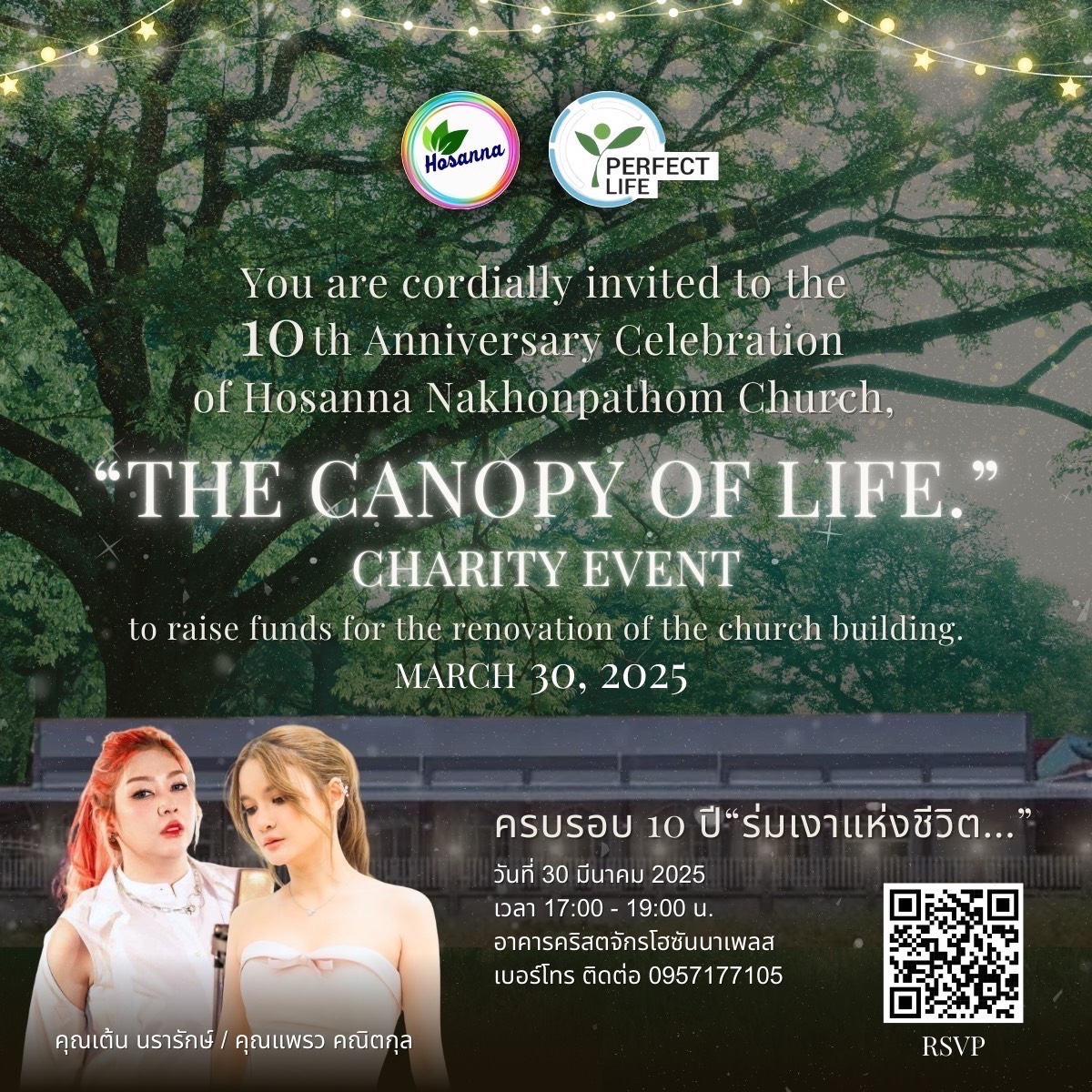 และขอเชิญร่วมงานครบรอบ 10 ปี “ร่มเงาแห่งชีวิต…” วันอาทิตย์ที่ 30 มีนาคม 2568 เวลา 17.00 – 19.00 น. ณ เอนกประสงค์ (Hosanna Place)