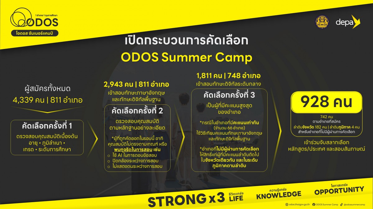 ผศ.ดร.ณัฐพล นิมมานพัชรินทร์ ผู้อำนวยการใหญ่ สำนักงานส่งเสริมเศรษฐกิจดิจิทัล หรือ ดีป้า เปิดเผยว่า ตามที่คณะรัฐมนตรีได้มอบหมายให้ กระทรวงดิจิทัลเพื่อเศรษฐกิจและสังคม โดย ดีป้า เป็นหน่วยงานหลักในการดำเนินโครงการ ODOS Summer Camp ค่ายแห่งโอกาสภาคฤดูร้อน ทุนการศึกษาแบบให้เปล่า จำนวน 928 ทุน ซึ่งมีวัตถุประสงค์เพื่อเปิดโอกาสให้เยาวชนไทยได้มีประสบการณ์การใช้ชีวิตและการศึกษาในมหาวิทยาลัยชั้นนำในต่างประเทศ ระยะเวลา 5 – 6 สัปดาห์ พร้อมยกระดับทักษะดิจิทัลจากเจ้าของเทคโนโลยีที่เป็นบริษัทเทคโนโลยีระดับโลก และค้นหาแรงบันดาลใจเพื่อต่อยอดไปสู่การเลือกสายการเรียนในระดับที่สูงขึ้น รวมไปถึงสายอาชีพในอนาคต โดยขณะนี้ผ่านการคัดเลือกผู้เข้าร่วมโครงการไปแล้ว 3 ครั้งโดยการทดสอบทักษะภาษาอังกฤษและทักษะดิจิทัล ซึ่งมีผู้ผ่านการคัดเลือก 928 คน
