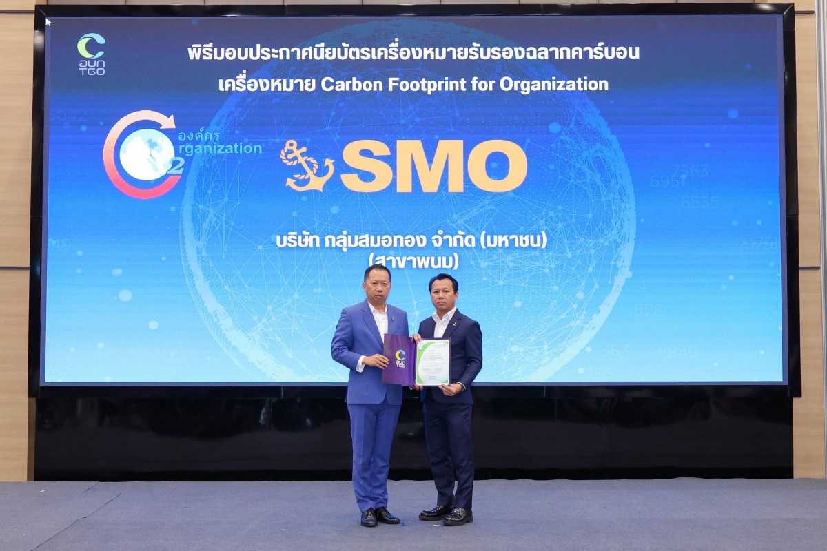 นายศักดา ทองรอง รองกรรมการผู้จัดการอาวุโส สายงานสำนักงาน บริษัท กลุ่มสมอทอง จำกัด (มหาชน) หรือ SMO เป็นตัวแทนบริษัทฯ สาขาพนม และ สาขาท่าชนะ เข้ารับประกาศนียบัตร เครื่องหมายรับรองฉลากคาร์บอน (Carbon Footprint for Organization : CFO) ในงานพิธีมอบประกาศนียบัตรเครื่องหมายรับรองฉลากคาร์บอน จัดโดย องค์การบริหารจัดการก๊าซเรือนกระจก (องค์การมหาชน) ณ ห้อง Conference Hall สถาบันเพื่อการยุติธรรมแห่งประเทศไทย (TIJ) ถนนแจ้งวัฒนะ โดยมี นายณกรณ์ ตรรกวิรพัท ผู้อำนวยการองค์การบริหารจัดการก๊าซเรือนกระจก เป็นประธานมอบประกาศนียบัตร การได้รับประกาศนียบัตรครั้งนี้สะท้อนถึงความมุ่งมั่นของบริษัทในการยกระดับมาตรฐานการดำเนินงานที่คำนึงถึงสิ่งแวดล้อม โดยบริษัทได้ให้ความสำคัญกับการบริหารจัดการปริมาณการปล่อยก๊าซเรือนกระจกอย่างจริงจัง รวมถึงการนำมาตรการลดการปล่อยก๊าซคาร์บอนไดออกไซด์มาใช้ในกระบวนการดำเนินงานขององค์กร เพื่อลดผลกระทบต่อสภาพภูมิอากาศ ซึ่งสอดคล้องกับเป้าหมายของประเทศในการมุ่งสู่ Carbon Neutrality และ Net Zero Emission การที่บริษัทได้รับประกาศนียบัตรทั้งสองสาขาในครั้งนี้จึงเป็นการตอกย้ำบทบาทผู้นำด้านการดำเนินธุรกิจที่ควบคู่ไปกับความรับผิดชอบต่อสังคมและสิ่งแวดล้อม