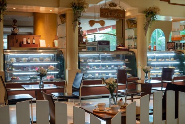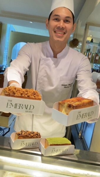 ด้วยฝีมือ เชฟเต้ – จักรพรรดิ พจน์ชัยกุล หัวหน้าเชฟเบเกอรี่ ผู้เข้าแข่งขันและชนะเชฟกระทะเหล็กสายหวาน จากรายการเชฟกระทะเหล็กประเทศไทย ยังได้คัดสรรเค้กต่างๆ ทั้งแบบปอนด์และแบบชิ้น อาทิ บลูเบอร์รี่ชีสเค้ก เป็นตัวเด่นซิกเนเจอร์ของโรงแรม เค้กเสาวรส ที่มีรสหวานอมเปรี้ยว สำหรับผู้ที่ไม่ชอบรสหวานนำ เค้กช็อคโกแลต ที่มีให้เลือกทั้งแบบหน้านิ่ม และ ช็อคโกแลตหนานุ่ม เค้กเรดเวลเวท หนึ่งในเค้กที่ได้รับความนิยมสูงสุดในโลก ด้วยสีแดงเข้มสะดุดตา เนื้อเค้กนุ่มละมุนเหมือนกำมะหยี่ และรสชาติที่เป็นเอกลักษณ์ผสมผสานระหว่างความหวานซ่อนเปรี้ยวอ่อนๆ และกลิ่นหอมของโกโก้ หรือแม้แต่ เค้กบลูเวลเวท ที่เป็นเนื้อชิฟฟ่อนกำมะหยี่สีฟ้าๆ บลูสดใส เป็นต้น เริ่มต้นเพียงชิ้นละ 100 บาท หรือปอนด์ละ 550 บาท